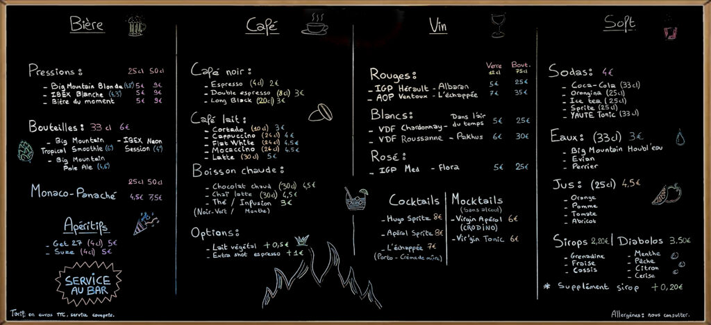 Nos bières locales sont brassées en Haute-Savoie exclusivement (Cluses ou Montriond). Nos vins ont été soigneusement choisis parmi une sélection exclusive à la restauration. Notre café est torréfié à Annecy par une équipe de passionnés.